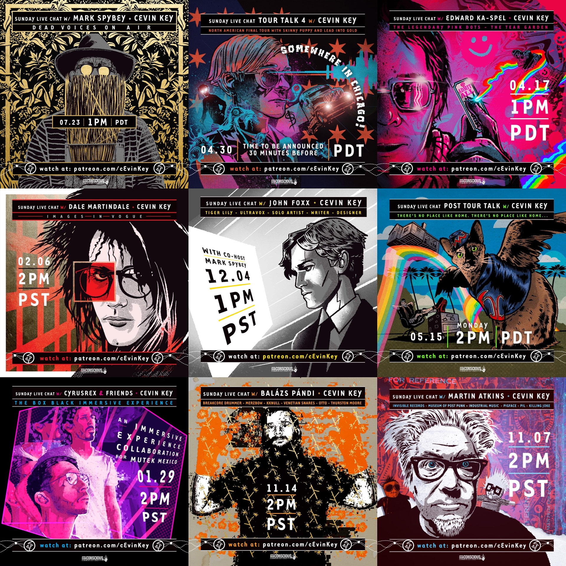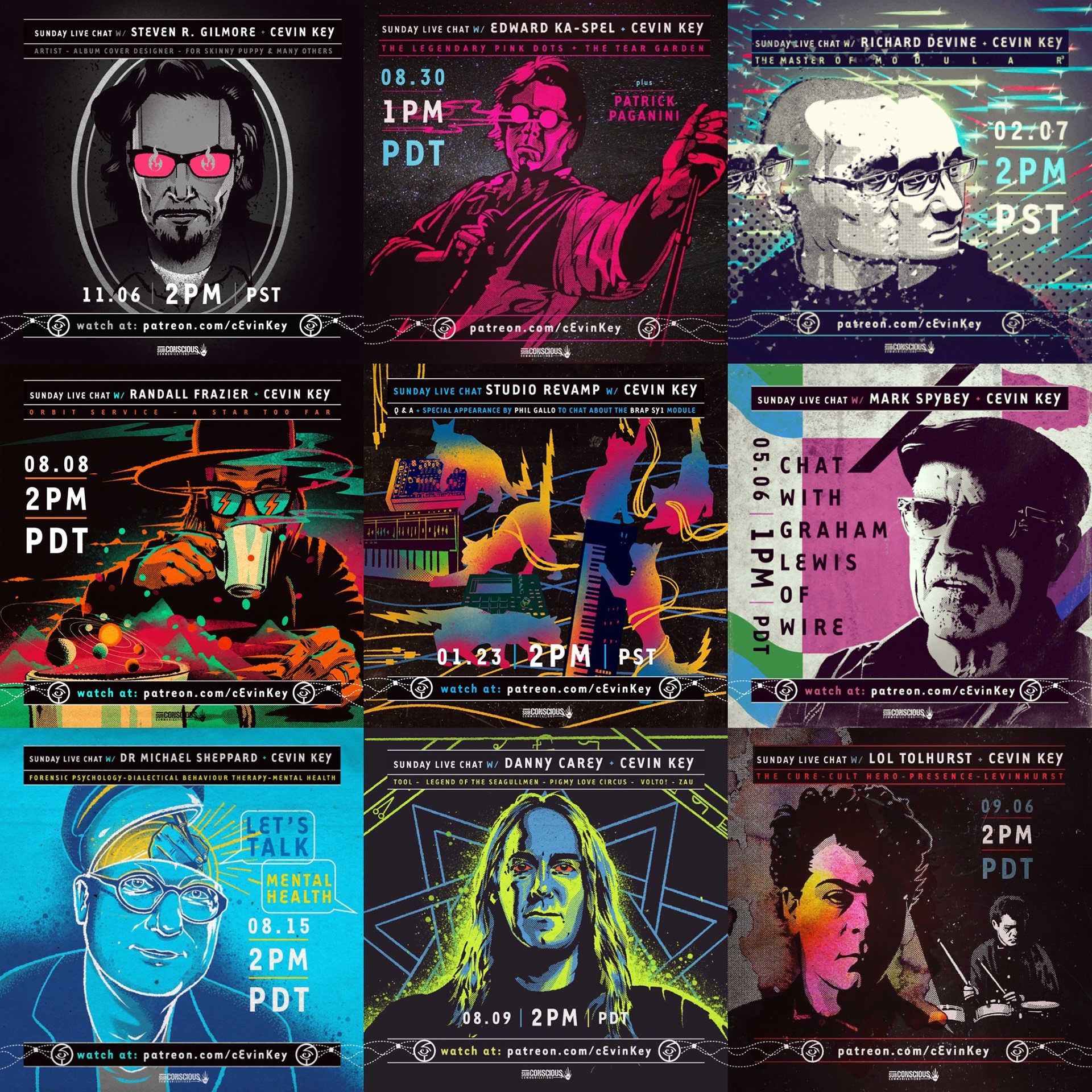 A selection of social ads for cEvin Key and his Patreon Sunday Live Chat with various artist every Sunday.