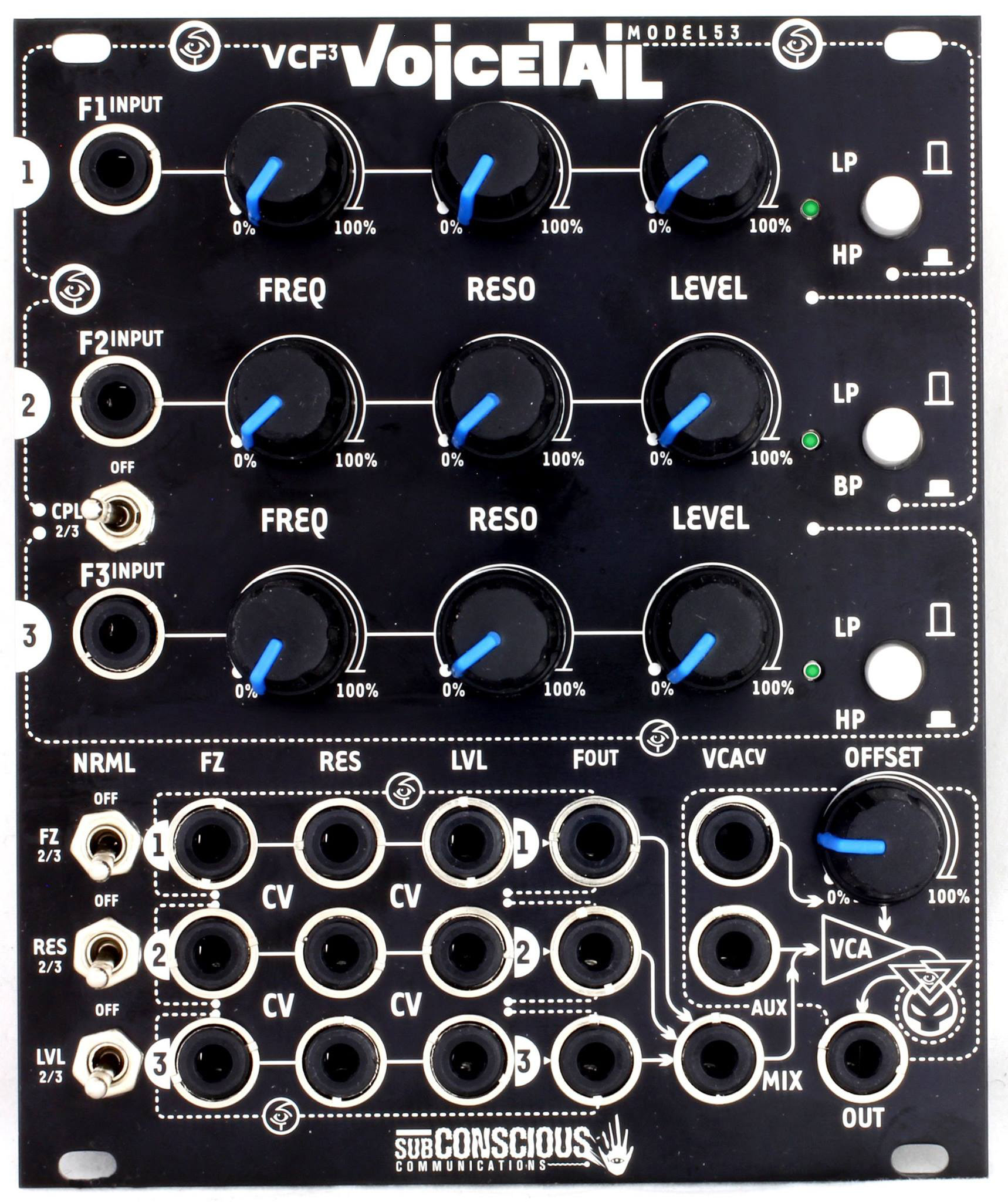 Modular Synth face plate designs for Subconscious Communications.
